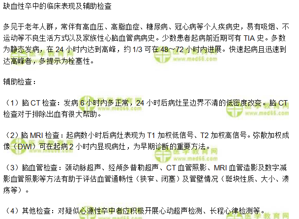 针对临床执业医师精神神经系统中“缺血性卒中的临床表现及辅助检查”相关考点,相信大家都在认真学习,为提高备考效率,在此医学教育网小编为大家整理如下内容: