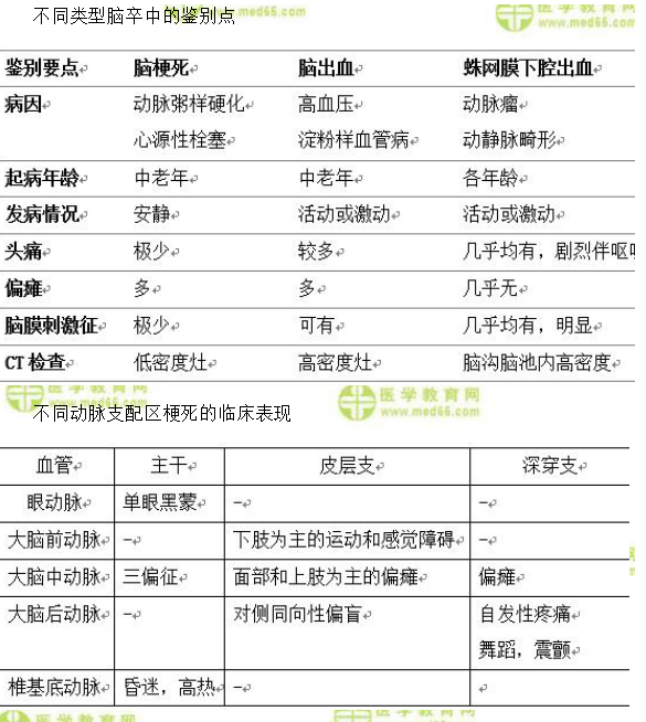 2.鉴别诊断应与其他脑血管病、颅内占位性病变相鉴别。有时还需与晕厥、低血糖发作、癫痫发作等相区别。(2019指南新增下述表格内容)