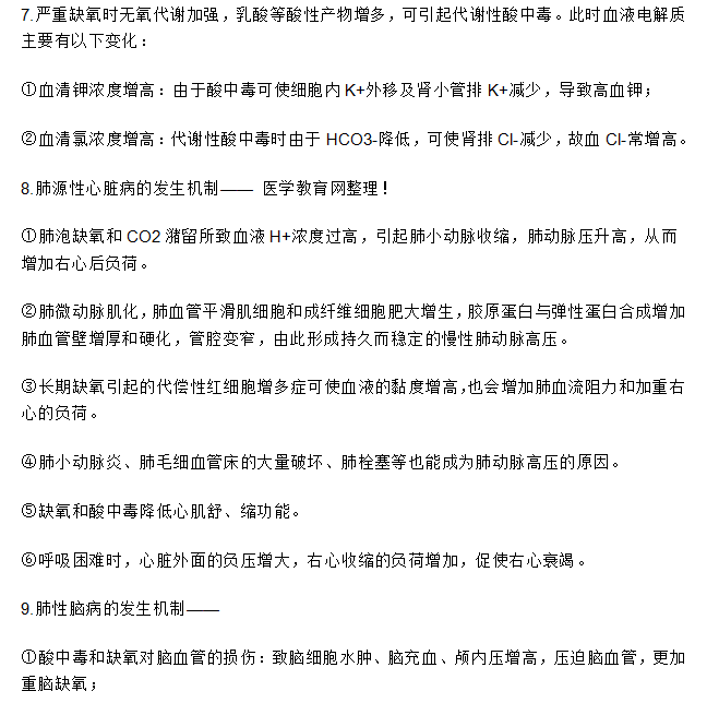 6.Ⅰ型和Ⅱ型呼吸衰竭时均有低氧血症,因此均可引起代谢性酸中毒;Ⅱ型呼吸衰竭时低氧血症和高碳酸血症并存,因此可有代谢性酸中毒和呼吸性酸中毒。