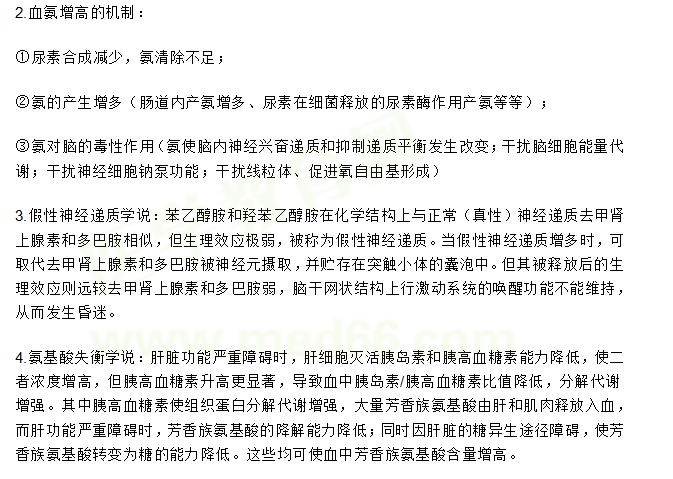 1.发病机制——氨中毒学说:其基础是星形胶质细胞功能受损。星形胶质细胞为神经元提供乳酸、α-酮戊二酸、谷氨酰胺及丙氨酸等营养物质,星形胶质细胞功能异常可以直接影响神经元的功能及代谢,并参与肝性脑病的发生发展。