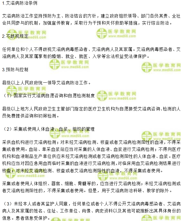 关于“临床执业卫生法规考点:艾滋病防治条例”相关内容,相信参加临床执业医师考试的考生都在关注,为方便大家了解,在此医学教育网小编为大家整理如下内容: