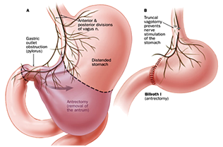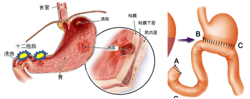 | 3)吻合口溃疡 | 术后2年内发病,症状与原来溃疡相似,疼痛更剧,易出血 | 先进行溃疡的正规非手术治疗 |