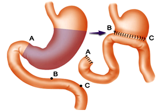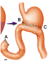 ②毕Ⅱ式:在胃大部切除后,将残留胃和上端空肠吻合,十二指肠残端缝合。
