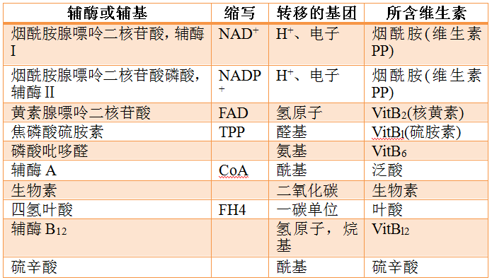 ①小分子有机化合物作为辅助因子的有机化合物多为B族维生素的衍生物或卟啉化合物,它们在酶促反应中主要参与传递电子、质子(或基团)或起运载体作用。