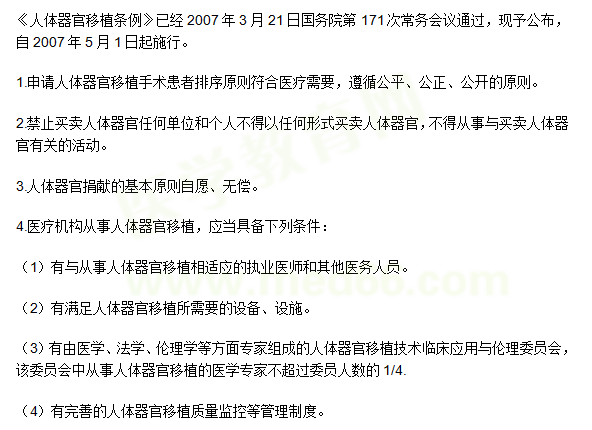关于“临床执业医师考试卫生法规考点:人体器官移植条例”相关信息,相信参加临床执业医师考试的考生都在关注,为方便大家了解,在此医学教育网小编为大家整理如下内容: