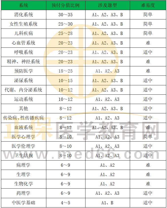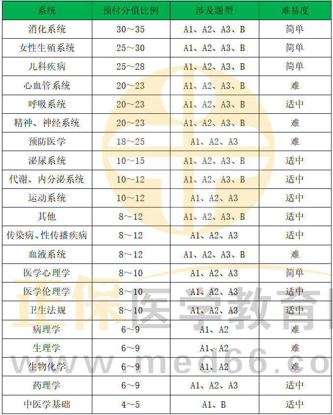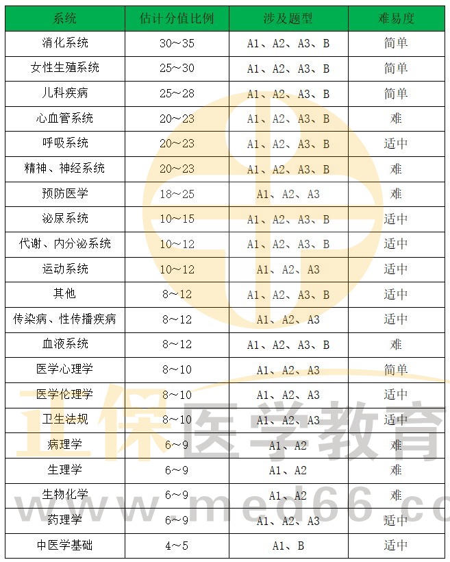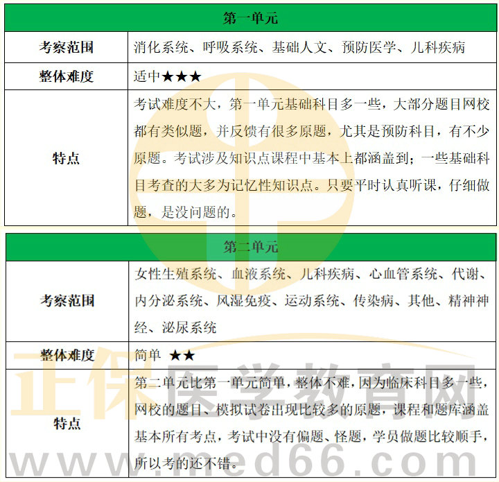 2.与一试相比,各单元的考试科目范围基本保持一致。第一单元侧重于预防医学、生理学、病理学、生物化学、人文、解剖学、药理学等科目;第二单元主要考察心血管系统、传染病、泌尿系统、血液系统、其他、运动系统、内分泌系统等临床医学科目和中医学基础部分,中医学基础部分虽为今年新增科目,但题目难度不大;第三单元主要考察消化系统、其他、呼吸系统、血液系统等科目;第四单元主要考察女性生殖系统、儿科、精神神经等科目。