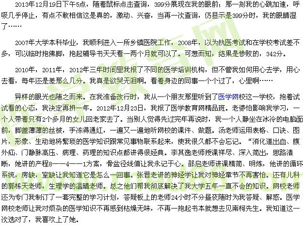 2013年的征文活动总是不乏精彩的文章。我的医考之路——我的梦想成真了(学员:QQ1622158054),让文章带我们走进他的医考之路。