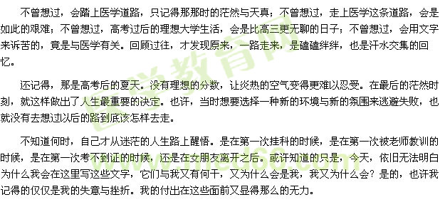 也许,这就是人生吧。都说要忘记一个人的时候,你是无法通过忘记来遗忘的。也许的是,在每个医学生的起步,都要经历这么一个开头吧。当你踏上一条不能回头的路时,也许只有这条路越难走,你才会有继续走下去的冲动,更多的是有要把它走好的理想。就在这样的情况下,有个小孩萌生了要做个名医的念头。
