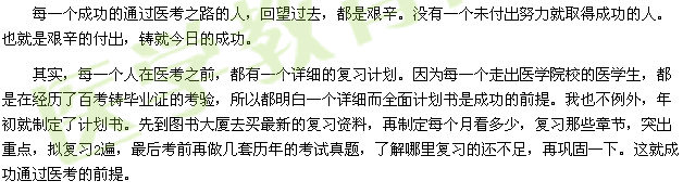 详细而全面计划书好制定,难就难在执行,贯彻执行是成功通过医考的保障。因为工作、家庭等各方面的原因,都影响着我们的执行。如我们在学校,就是两耳不闻窗外事,一心只读圣贤书。每天就是一心学习,没有干扰因素。而现在,白天我们要工作,尤其是我们,在单位是新人,又没有资格证书,在单位只有多干活、多付出、加班加点、表现优秀,才能适应于这竞争激烈的环境不被淘汰。