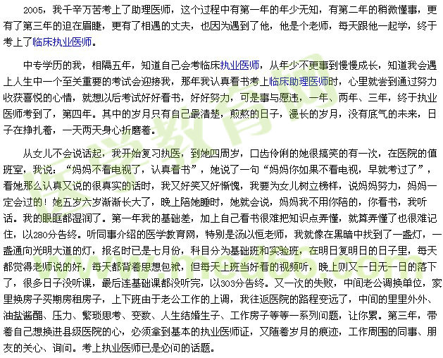 2013年医学教育网举行了大型征文活动——我的医考之路,以下是学员代码为xuguo****的学员的征文,让我们一起来见证她的医考之路吧!