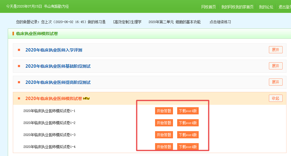 第二步:选课2020年临床执业医师模拟试卷,点开即可做题啦!