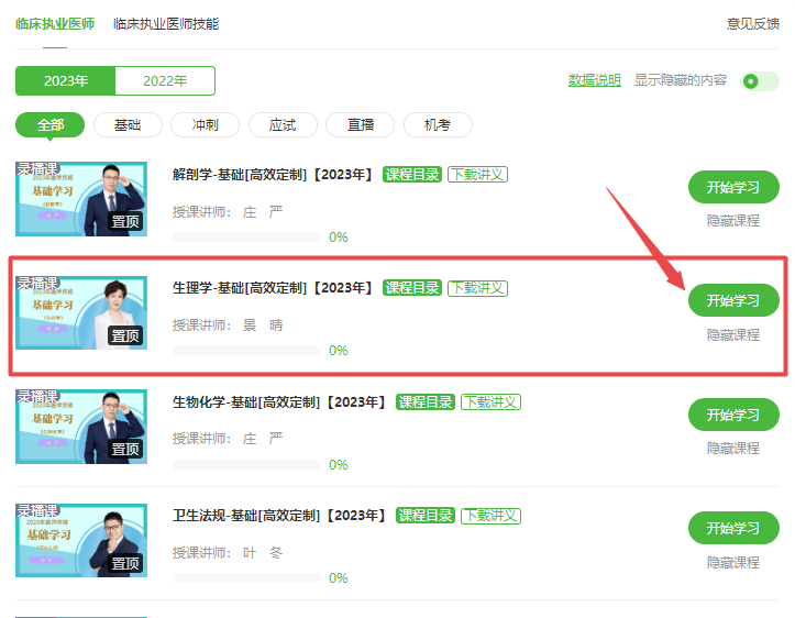 2023年医师备考全面开启!2023年临床执业医师基础学习新课开通!目前由景晴老师授课的《生理学》科目课程已更新!已购课同学可以直接进入我的网校我的家-我的课程-生理学科目进行学习!关于2023年临床执业医师《生理学》考试大纲/教材变动的相关内容,具体内容下方查看。未购课学员点击此处进入选择课程>>,具体看课位置如下: