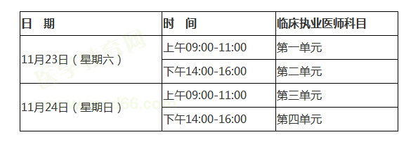 临床执业医师综合笔试二试考试时间为11月23、24日两天举行,考试时间为2天,分4个单元,每单元均为两个小时,考试形式为机考!