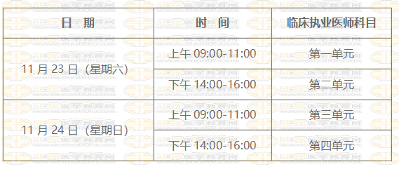 2019年在天津、吉林、上海、江苏(新增)、福建、湖南(新增)、广东(新增)、广西、海南、贵州、云南、宁夏(新增)12个地区开展临床执业医师、临床执业助理医师、中医类别执业医师和中医类别执业助理医师综合笔试“一年两试”试点。考试时间为11月23日和24日: