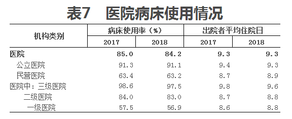 (三)病床使用。2018年,全国医院病床使用率84.2%,其中:公立医院91.1%。与上年比较,医院病床使用率下降0.8个百分点(其中公立医院下降0.2个百分点)。2018年医院出院者平均住院日为9.3日(其中:公立医院9.3日),医院出院者平均住院日与上年持平(见表7)。