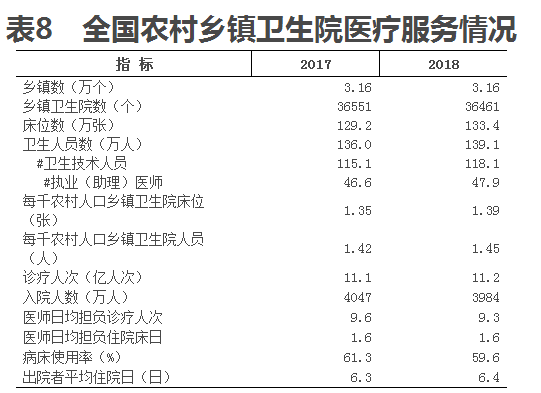 2018年,乡镇卫生院诊疗人次为11.2亿人次,比上年增加0.1亿人次;入院人数3984万人,比上年减少63万人。2018年,医师日均担负诊疗9.3人次和住院1.6床日。病床使用率59.6%,出院者平均住院日6.4日。与上年相比,乡镇卫生院医师工作负荷略有下降,病床使用率下降1.7个百分点,平均住院日比上年延长0.1日。