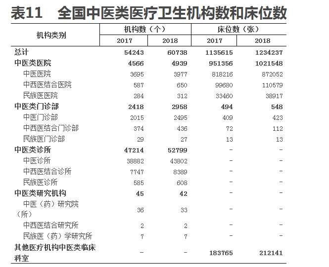 (一)中医类机构、床位及人员数。2018年末,全国中医类医疗卫生机构总数达60738个,比上年增加6495个。其中:中医类医院4939个,中医类门诊部、诊所55757个,中医类研究机构42个。与上年比较,中医类医院增加373个,中医类门诊部及诊所增加6125个(见表11)。