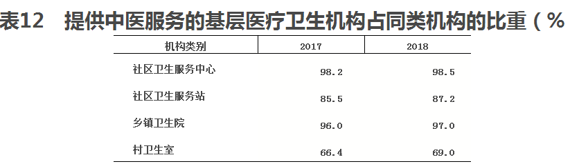 2018年末,提供中医服务的社区卫生服务中心占同类机构的98.5%,社区卫生服务站占87.2%,乡镇卫生院占97.0%,村卫生室占69.0%(见表12)。