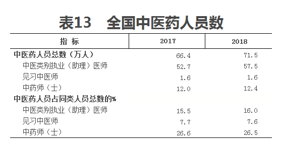 2018年末,全国中医药卫生人员总数达71.5万人,比上年增加5.1万人(增长7.7%)。其中:中医类别执业(助理)医师57.5万人,中药师(士)12.4万人。两类人员较上年有所增加(见表13)。