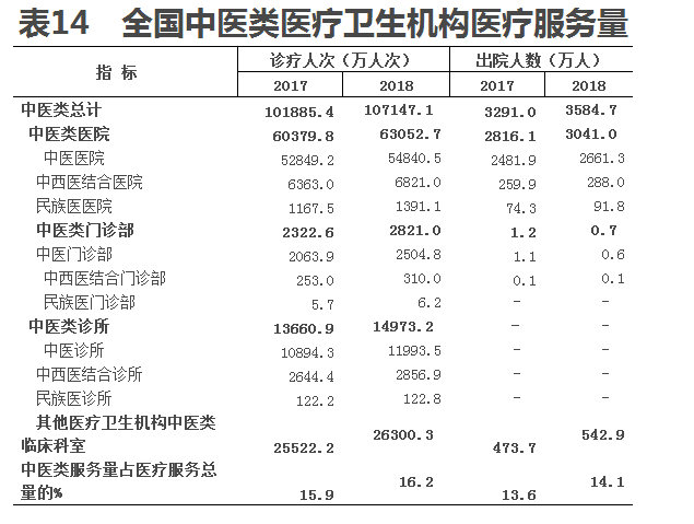 (二)中医医疗服务。2018年,全国中医类医疗卫生机构总诊疗人次达10.7亿人次,比上年增加0.5亿人次(增长5.2%)。其中:中医类医院6.3亿人次(占58.8%),中医类门诊部及诊所1.8亿人次(占16.6%),其他医疗机构中医类临床科室2.6亿人次(占24.5%)。