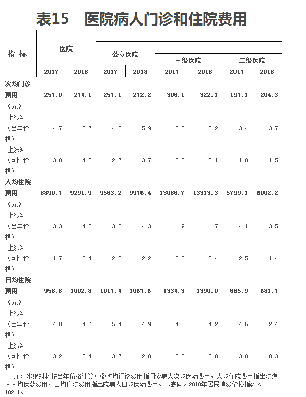 (二)基层医疗卫生机构病人医药费用。2018年,社区卫生服务中心次均门诊费用132.3元,按当年价格比上年上涨13.1%,按可比价格上涨10.8%;人均住院费用3194.0元,按当年价格比上年上涨4.4%,按可比价格上涨2.3%。