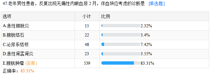 以上就是医学教育网关于“急性膀胱炎、膀胱肿瘤、急性肾盂肾炎易混淆考点模考正确率83.31%”的相关介绍,希望能够帮助到大家,更多资讯尽在医学教育网临床执业医师栏目!