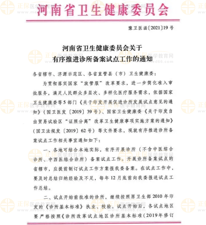 《通知》明确,各地可结合实际,提前制定工作方案报河南省卫健委备案后,有序开展诊所备案试点工作。