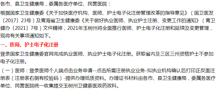玉树州卫健委发布了“关于做好执业医师、执业护士注册、延续、变更工作的通告”,医学教育网为了帮助广大考生及时了解注册的信息,特整理了官方文件全文如下: