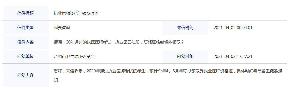 合肥卫健委回答:您好,来信收悉,2020年通过执业医师考试的考生,预计今年4、5月年可以领取到执业医师资格证,具体时间需等省卫健委通知。
