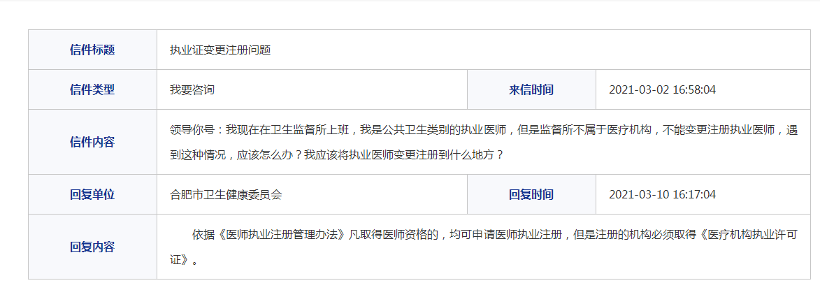 提问二:我现在在卫生监督所上班,我是公共卫生类别的执业医师,但是监督所不属于医疗机构,不能变更注册执业医师,遇到这种情况,应该怎么办?我应该将执业医师变更注册到什么地方?