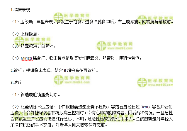 本病临床常见,近几年不常考,但应重视。该知识点题量不大,医学|教育网重点掌握内容依次为临床表现、辅助检查,适当了解诊断和治疗。熟悉结石性质,以及特征性的“白胆汁”,考试题型多为A1和A2型题。