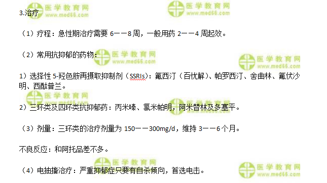 抑郁症为常考内容,抑郁症的临床表现和诊断是重点,应熟练掌握,抑郁症的治疗应熟悉常考的细节如下医学|教育网,考试多为A型题。