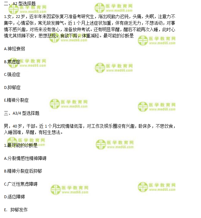 1.D【答案解析】心境低落,兴趣和乐趣降低,精力下降是抑郁症的核心症状,其他伴随症状如早醒是其典型的睡眠障碍,食欲和性欲下降是典型的生物学症状,还有自信心下降,自责和自杀观念等。医学|教育网国际诊断标准要求至少2条核心症状和两条其他症状,本例完全符合。抑郁症的诊断优先于神经症。本例没有精神分裂症一级症状。