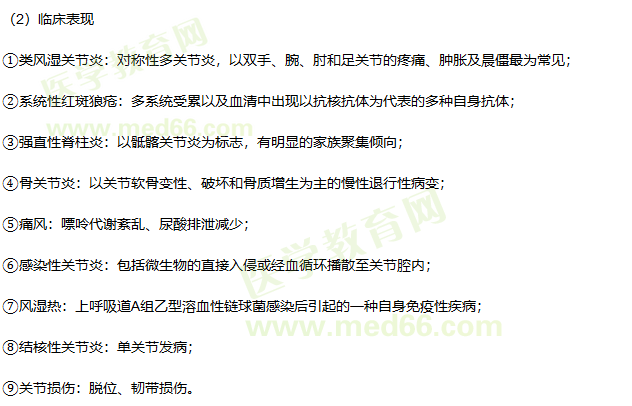 类风湿关节炎:对称性多关节炎,以双手、腕、肘和足关节的疼痛、医学|教育网肿胀及晨僵最为常见;