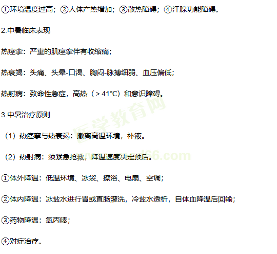 核心内容为中暑的临床表现,同时,急救处理也是一个常考点,该知识点每年考0——1分,复习上没有难点,记忆即可医学|教育网。