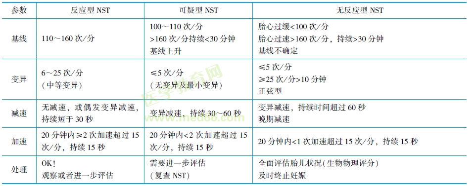 无应激试验(NST):在无宫缩、医学|教育网无外界负荷刺激下,对胎儿进行胎心率宫缩图的观察和记录,以了解胎儿储备能力。本试验根据胎心率基线、胎动时胎心率变化(变异、减速和加速)等分为有反应型NST、可疑型NST和无反应型NST。