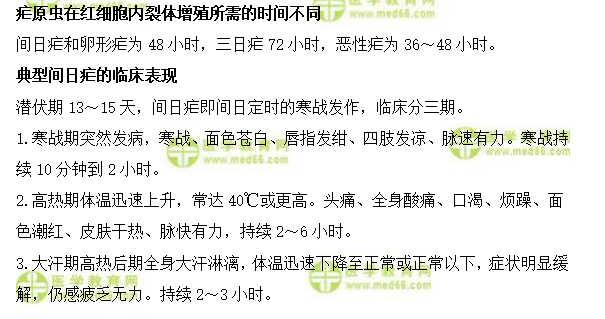 临床特点:间歇性定时发作的寒战、高热、继以大汗而缓解,常有脾大与贫血。