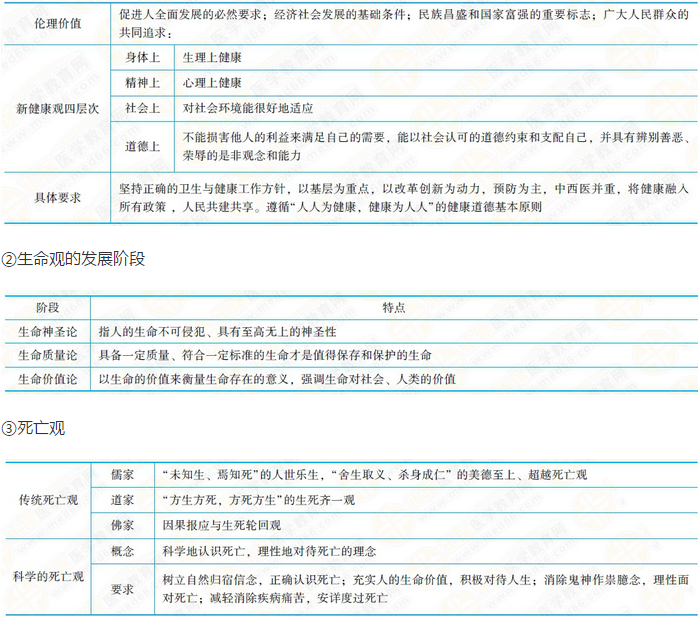 (4)医学伦理学的基本观点:健康观、生命观和死亡观。