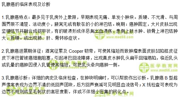 关于“临床执业助理医师其他考点:乳腺癌的临床表现及诊断”相关内容,相信参加临床执业助理医师考试的考生都在关注,为方便大家了解,在此医学教育网小编为大家整理如下内容: