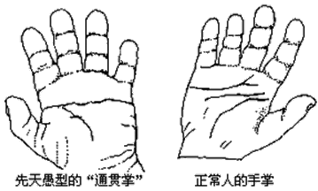 >>皮肤纹理特征:皮肤细腻,可有通贯手,手掌三叉点移向掌心。