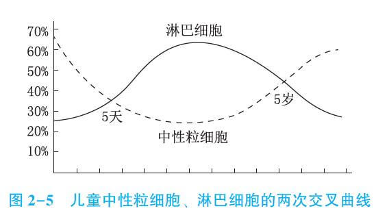 出生时白细胞总数(15~20)×109/L,婴儿期维持在10×109/L左右,8岁以后接近成人水平。中性粒细胞与淋巴细胞比例的变化要发生两次交叉,即“双5交叉”,是指出生时中性粒细胞约占0.65,淋巴细胞约占0.30,随着白细胞总数的下降,中性粒细胞比例也相应下降,生后4~6天(平均第5天)时两者比例大致相等。之后淋巴细胞约占0.60,中性粒细胞约占0.35,至4~6岁(平均5岁)时两者比例又相等,之后两者比例达成人水平。