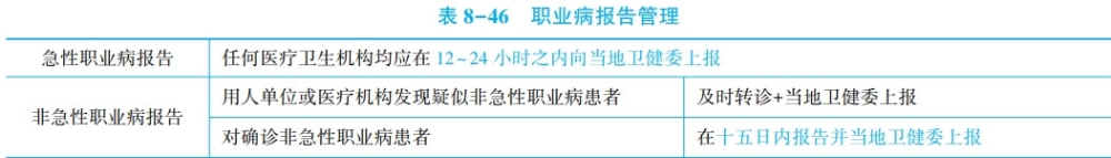 4.职业病报告管理 按照《中华人民共和国职业病防治法》的要求,用人单位和医疗卫生机构发现职业病患者或者疑似职业病患者时,应当及时向所在地卫生行政部门报告。
