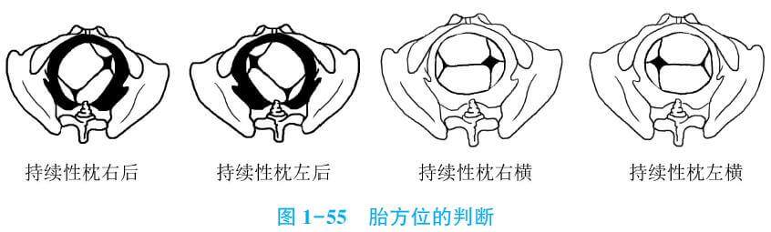 4.肛门检查或阴道检查 若胎头矢状缝位于骨盆左斜径上,前囟在骨盆右前方,后囟(枕部)在骨盆左后方则为枕左后位,反之为枕右后位。查明胎头矢状缝位于骨盆横径上,后囟在骨盆左侧方,则为枕左横位,反之为枕右横位。