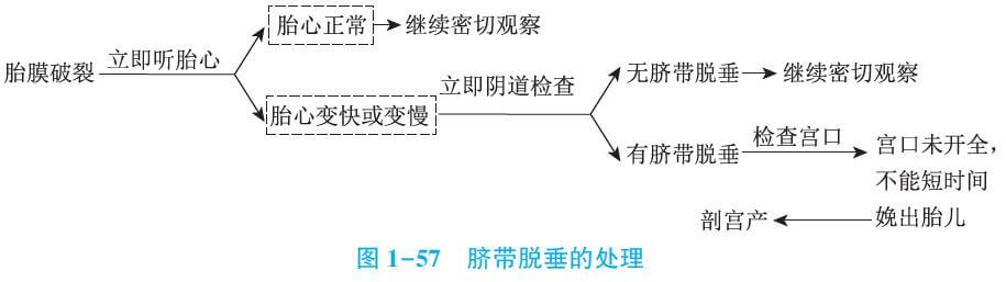 一旦破膜立即听胎心。若胎心有异常应立即阴道检查,了解有无脐带脱垂。若有脐带脱垂,胎心尚好,宫口未开全,应立即剖宫产。若无脐带脱垂,可继续严密观察胎心及产程进展。