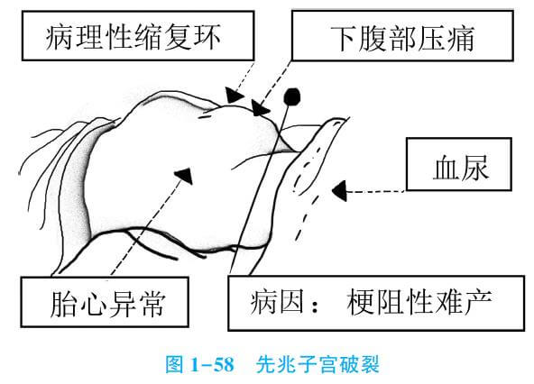 见于产程长、有梗阻性难产因素的产妇。子宫病理缩复环形成、下腹部压痛、胎心率异常和血尿,是先兆子宫破裂四大主要表现。