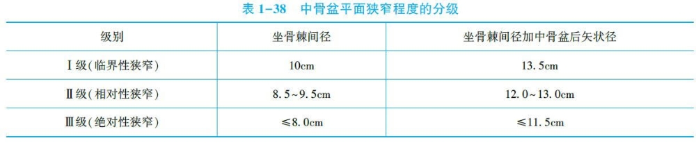 坐骨棘间径<10cm,坐骨切迹宽度<3横指——为中骨盆平面狭窄。