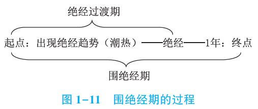 绝经过渡期——是指从开始出现绝经趋势直至最后一次月经的时期。一般始于40岁,历时短则1~2年,长至10~20年。