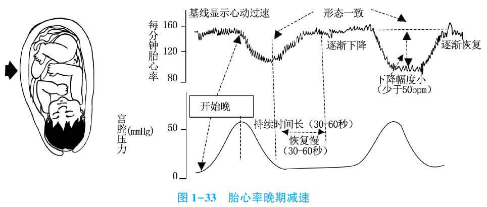 波形特点:早期减速胎心率曲线下降与宫缩曲线上升同时开始,曲线最低点与宫缩曲线高峰一致,持续时间短,恢复快,宫缩后迅速恢复正常。