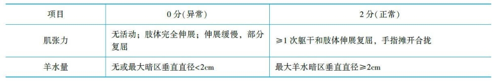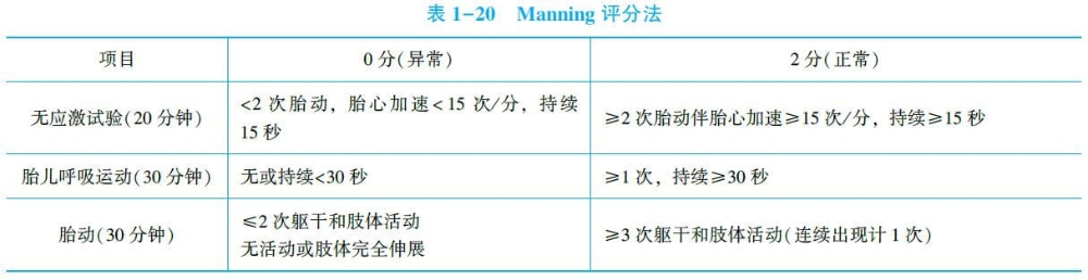 3)胎儿生物物理监测(Manning评分):是通过联合应用电子胎儿监护和B型超声来判断有无存在胎儿宫内缺氧和胎儿酸中毒情况。Manning 评分法满分为10分,10~8分无缺氧,8~6分可能有缺氧,6~4分有急性或慢性缺氧,4~2分有急性缺氧伴慢性缺氧,0分有急慢性缺氧。