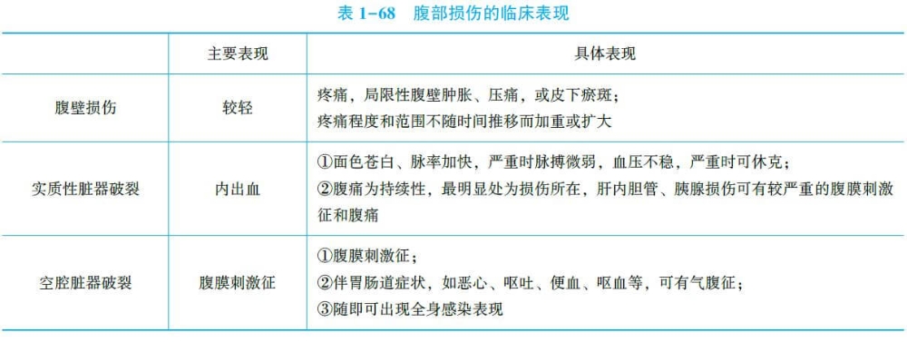 (1)单纯实质性器官损伤:出血为主。腹痛不重,压痛和肌紧张也不明显。出血量多时可有腹胀和移动性浊音。但肝、脾破裂后,因局部积血凝固,在测试移动性浊音时可出现固定性浊音。